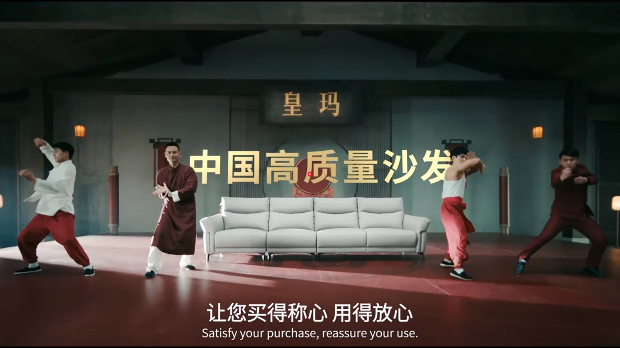 最后,四位功夫主角再次施展功夫动作,动作整齐划一,气势磅礴。他们的每一个招式都刚劲有力,展现出皇玛・康之家的自信与担当。与此同时,“中国高质量沙发”几个大金字熠熠生辉地出现在皇玛沙发的上方,为整个广告片画上了一个完美的句号,也深深烙印在消费者的记忆中。