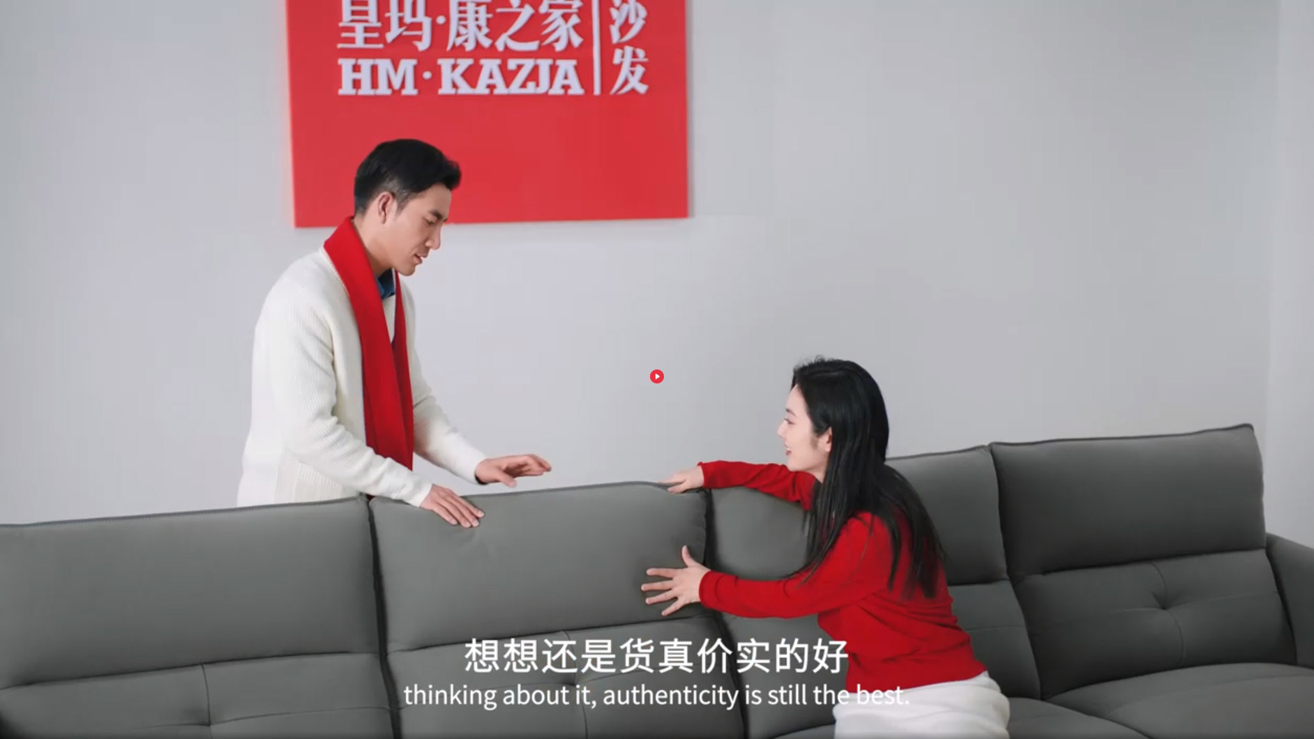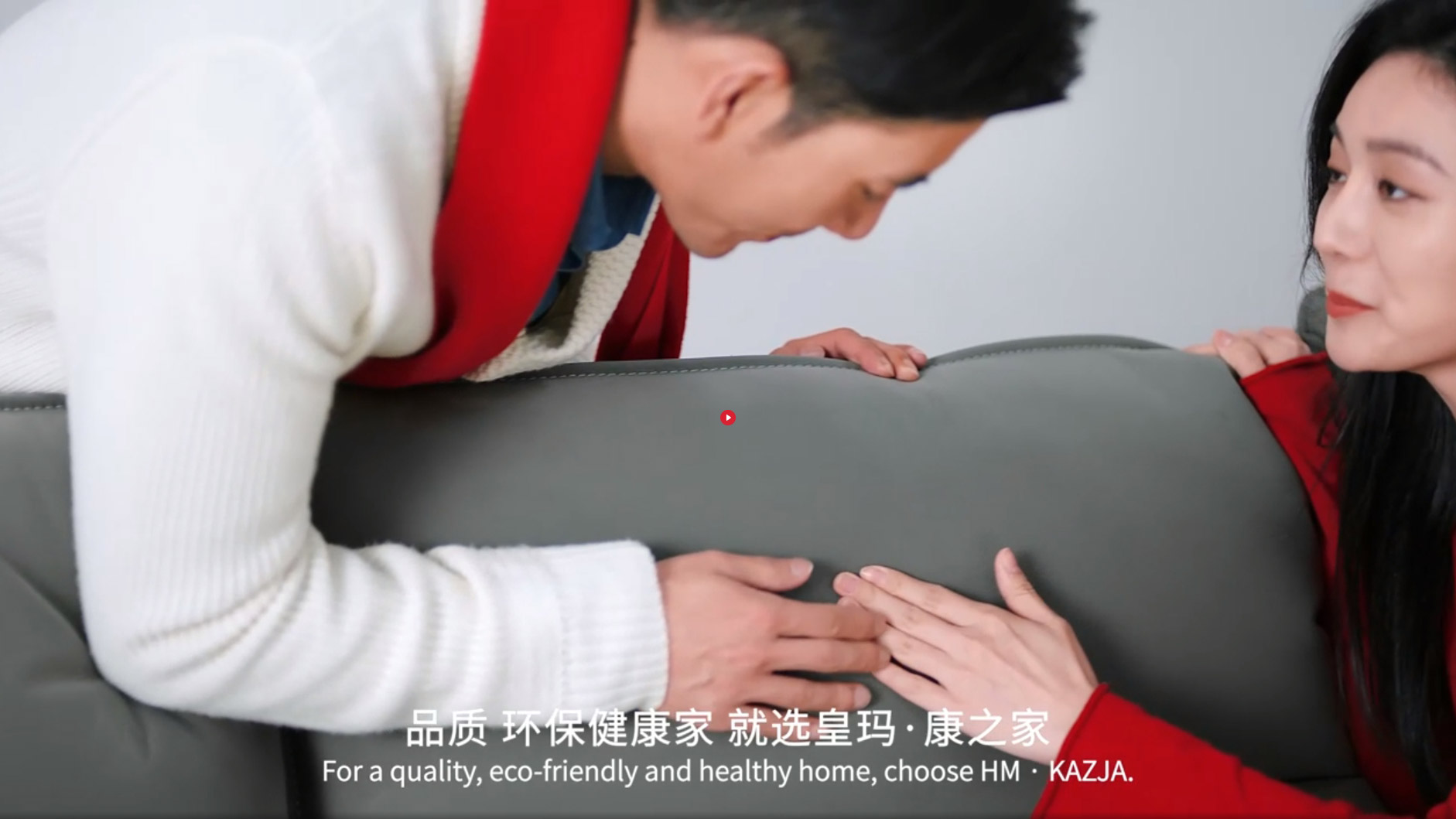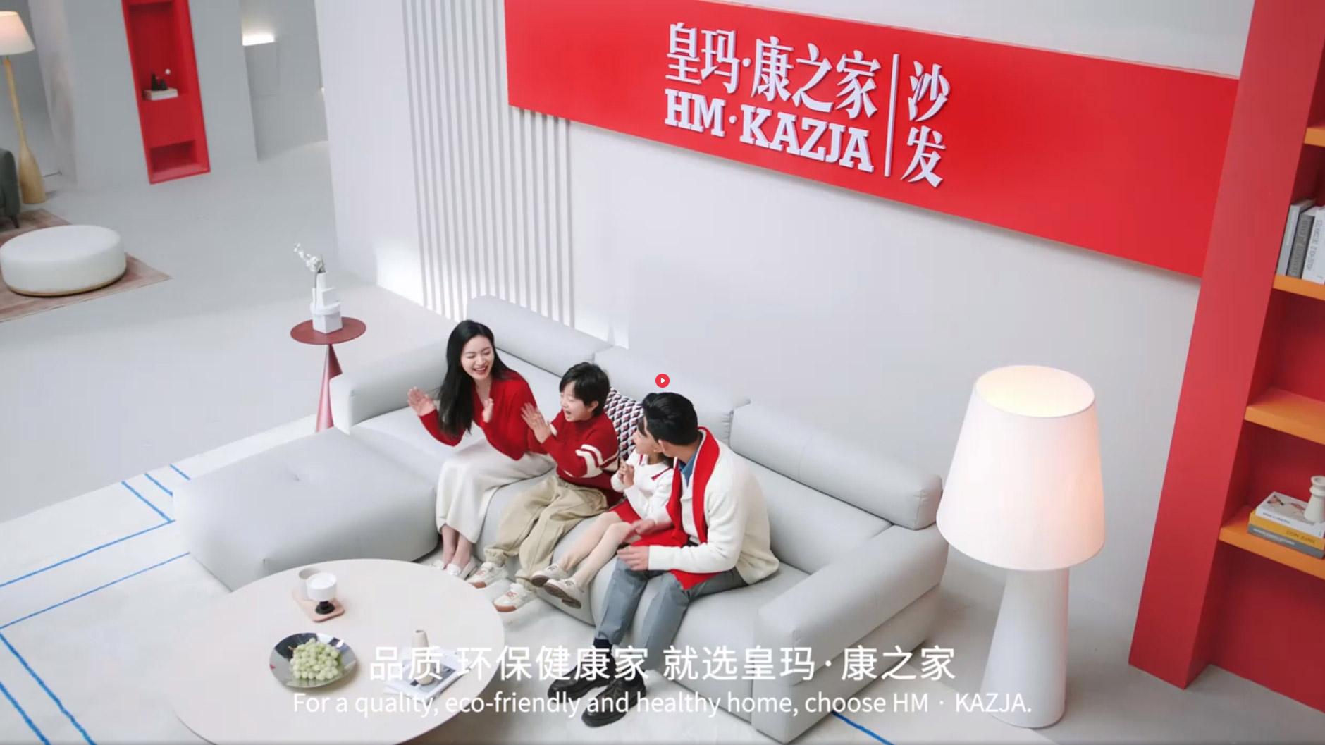 TVC画面采用温情家庭场景。孩子们在皇玛沙发旁嬉戏打闹,天真烂漫的笑容里透着对沙发的全然信任,这种不加修饰的亲近感,比任何广告语都更能证明产品的安全性。年轻夫妻俯身查看沙发细节时的专注,体验坐感后的频频点头,将消费者选购时的谨慎与满意具象化,最后一家四口手拉手躺在沙发上鼓掌的画面,更是将“健康家”的理念落到实处。