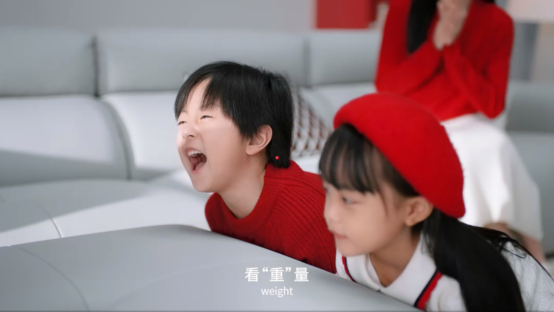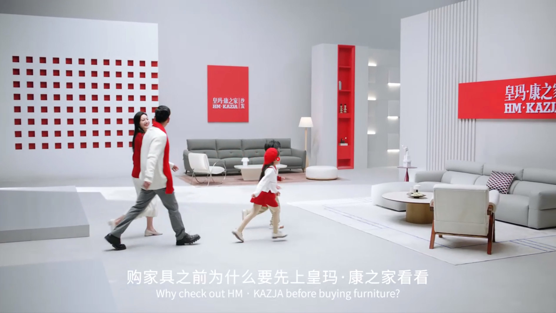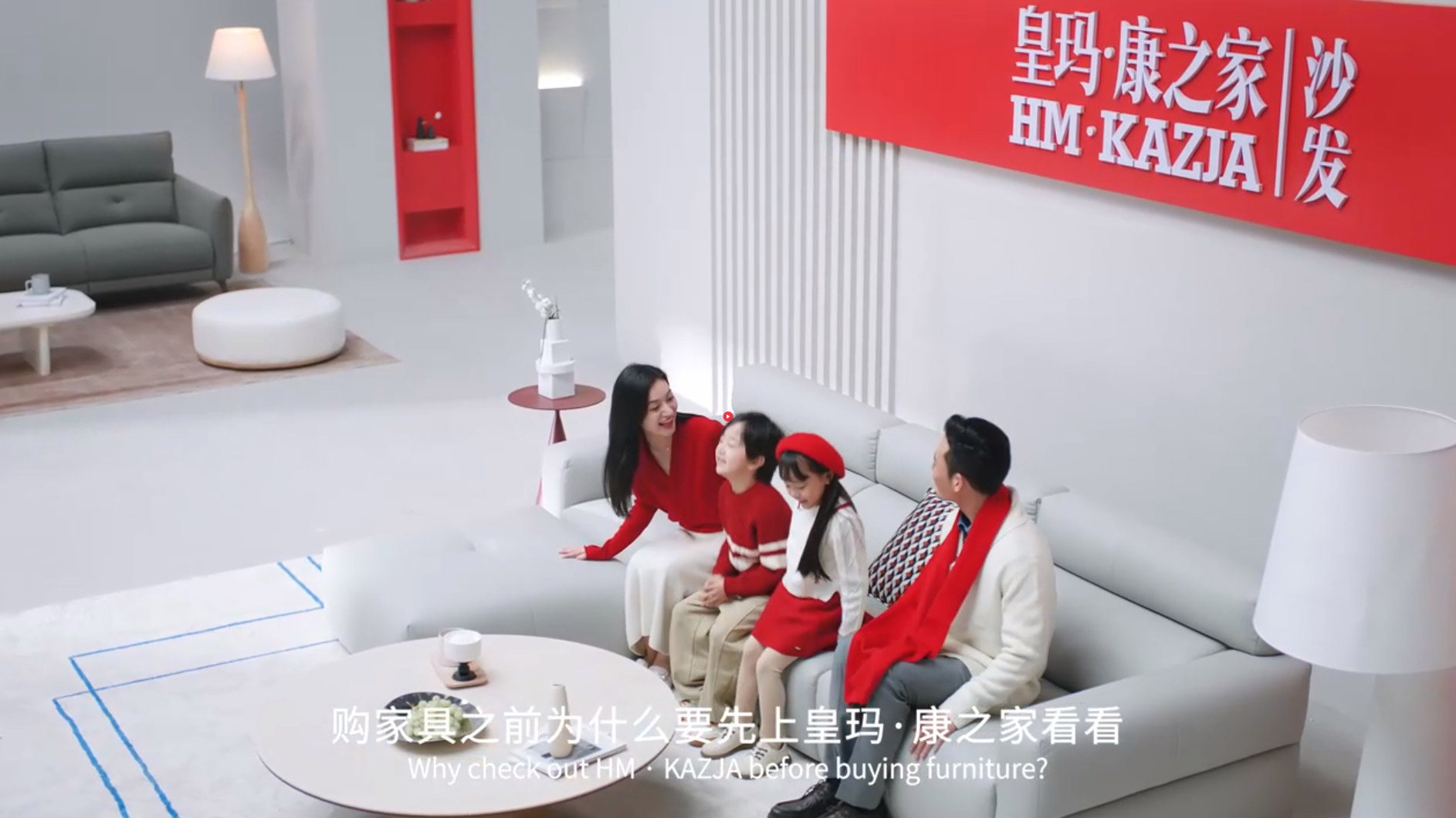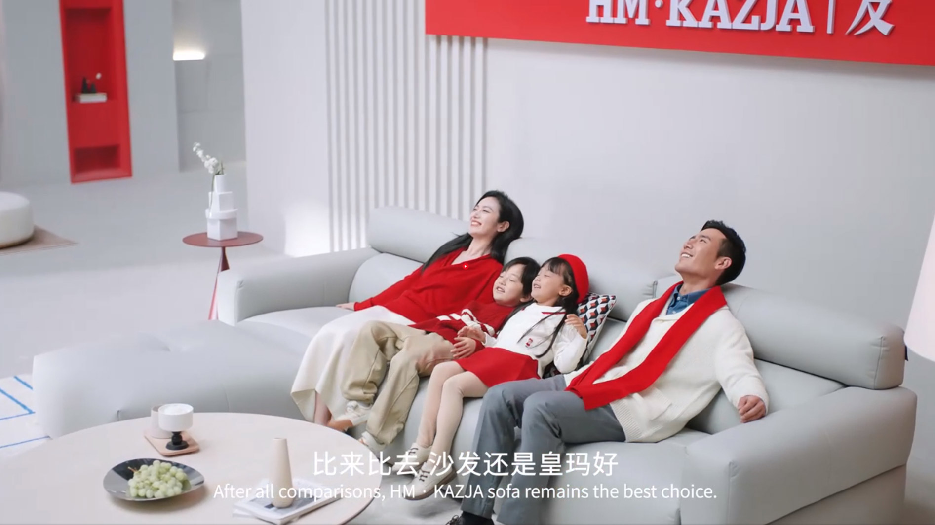 TVC画面中一家四口的互动场景,为“理性消费”增添了情感温度。体验店里,一家四口与沙发内架、布料、海绵等的互动,令消费者产生强烈的趋同感与信任感;一系列的比较,以及消费者的发声与竖大拇指等正向表达与肯定,“好沙发看用材 比比还是皇玛好”的文案与这一画面叠加,品牌“中国高质量沙发”的定位便有了最坚实的用户基础。一家人围坐在沙发上相视而笑,让沙发成为家庭幸福的承载者和见证者,让“高质量”也转化为可感知的幸福生活体验。
