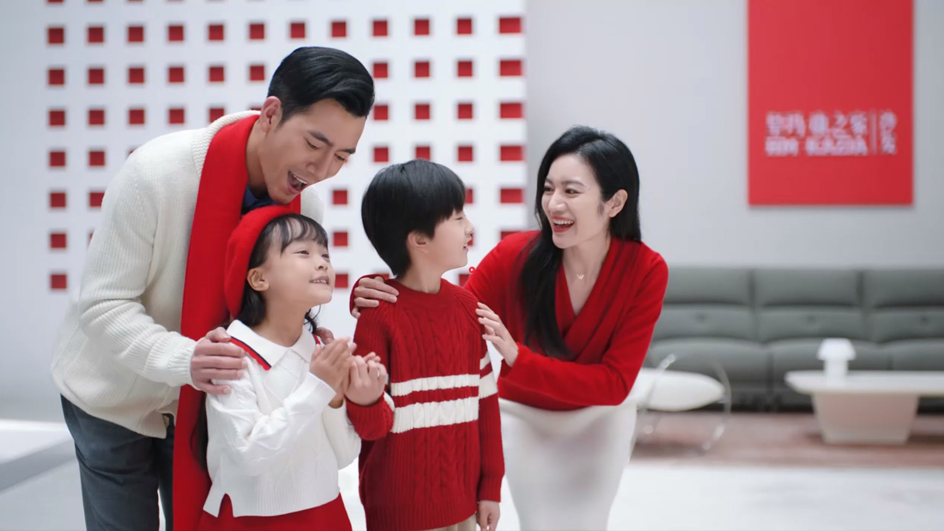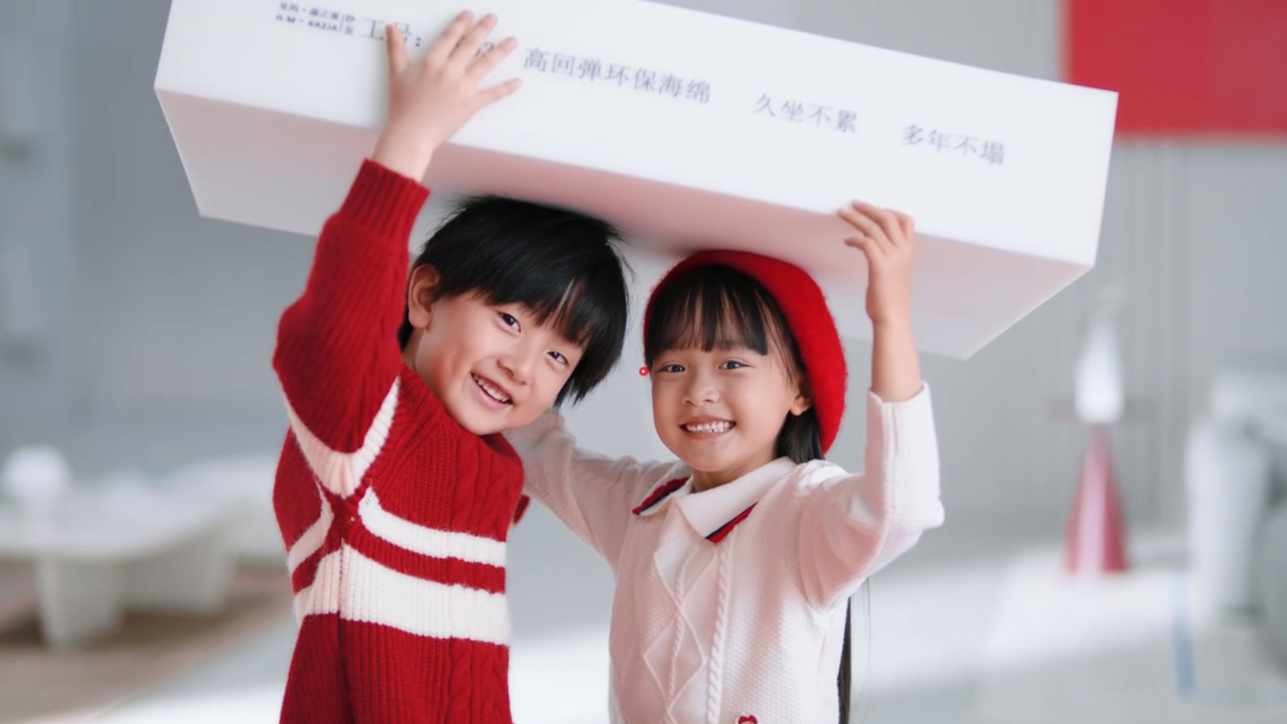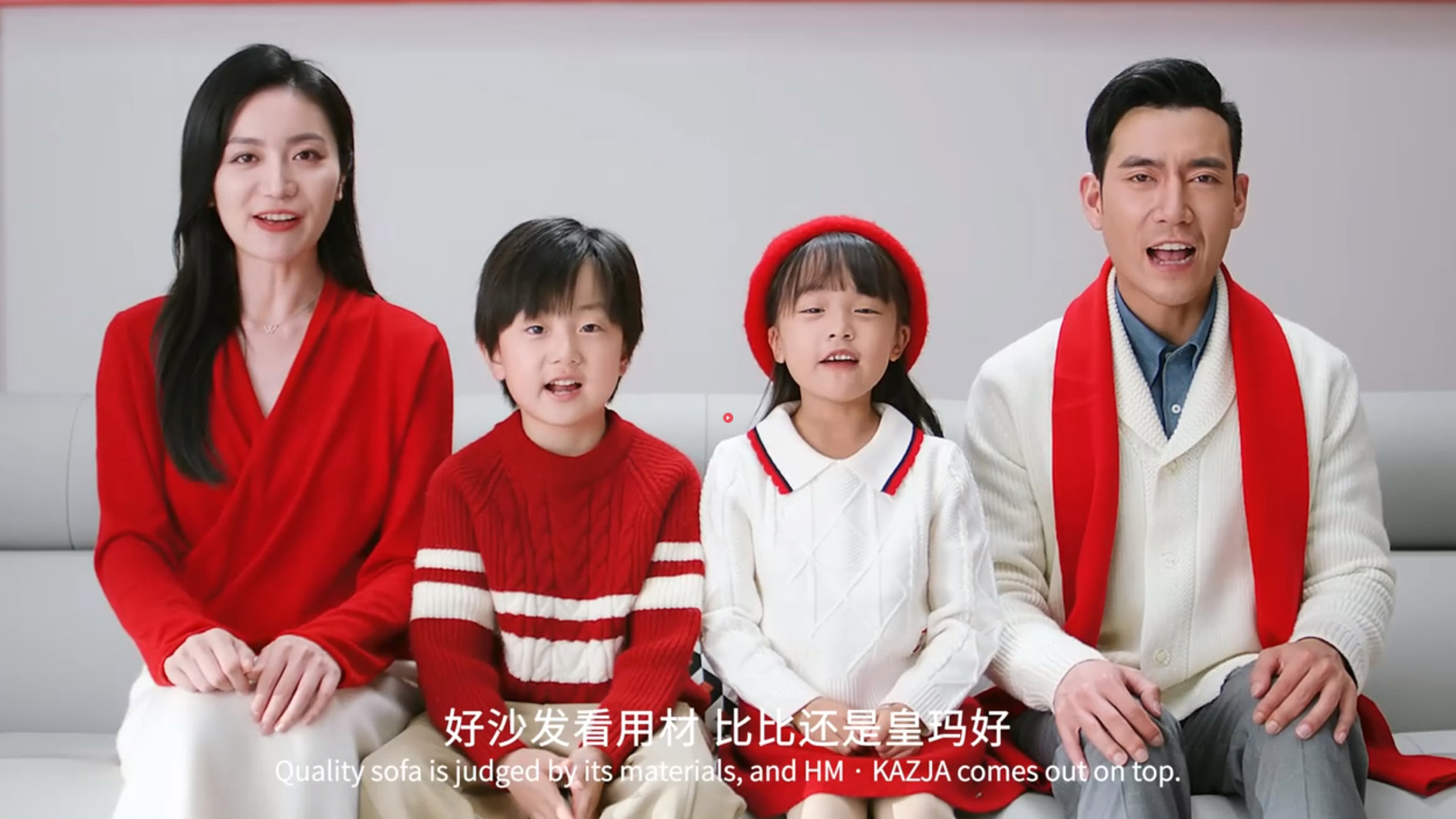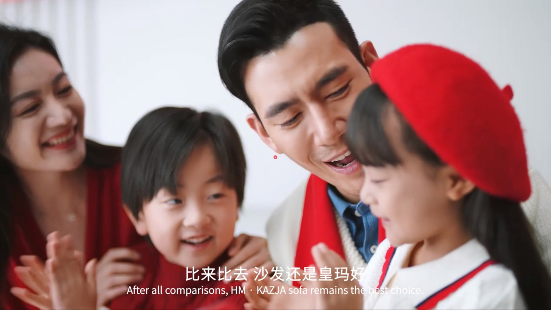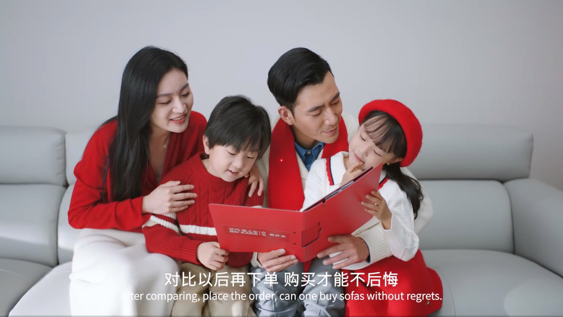 TVC画面中一家四口的互动场景,为“理性消费”增添了情感温度。体验店里,一家四口与沙发内架、布料、海绵等的互动,令消费者产生强烈的趋同感与信任感;一系列的比较,以及消费者的发声与竖大拇指等正向表达与肯定,“好沙发看用材 比比还是皇玛好”的文案与这一画面叠加,品牌“中国高质量沙发”的定位便有了最坚实的用户基础。一家人围坐在沙发上相视而笑,让沙发成为家庭幸福的承载者和见证者,让“高质量”也转化为可感知的幸福生活体验。