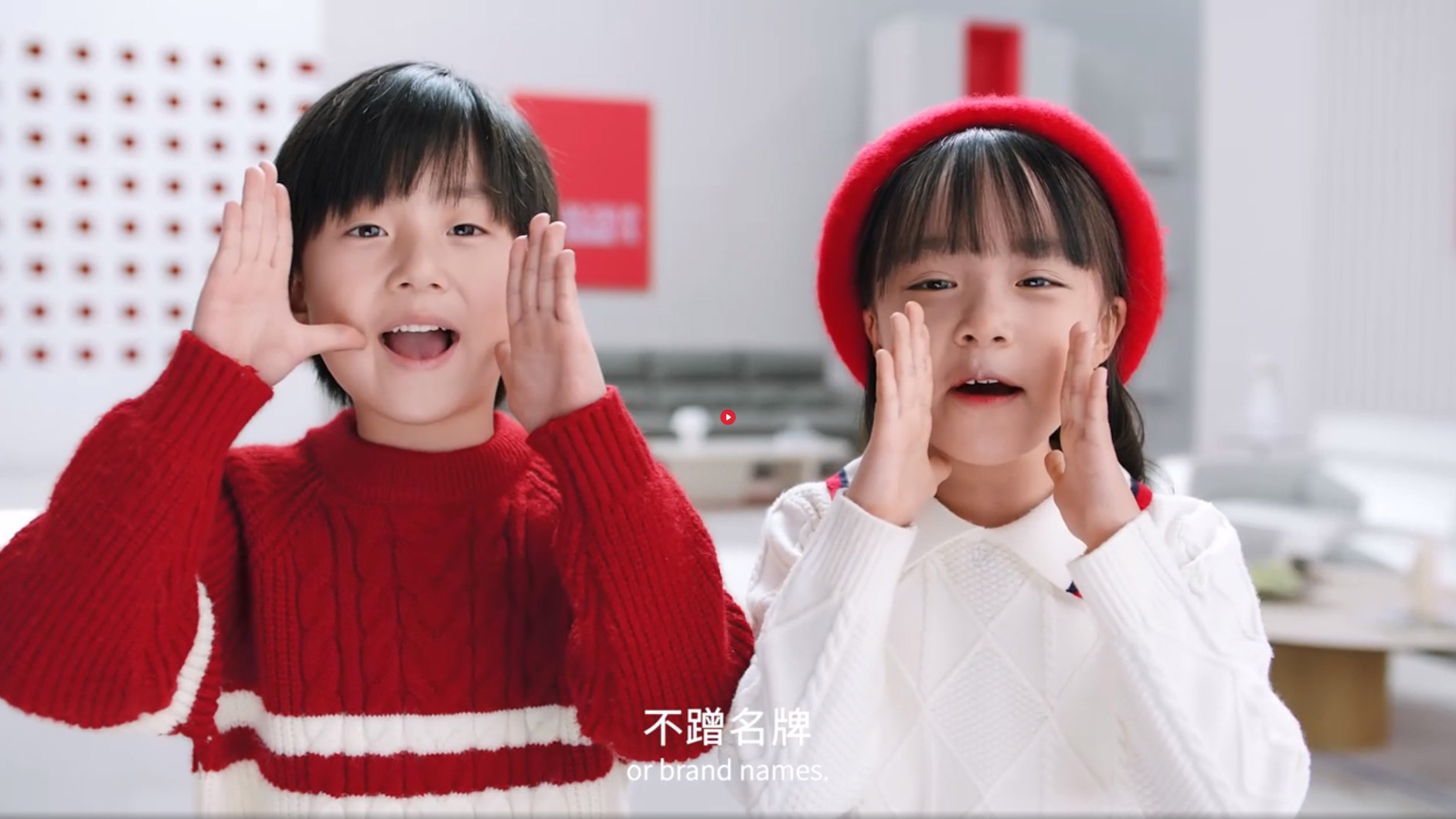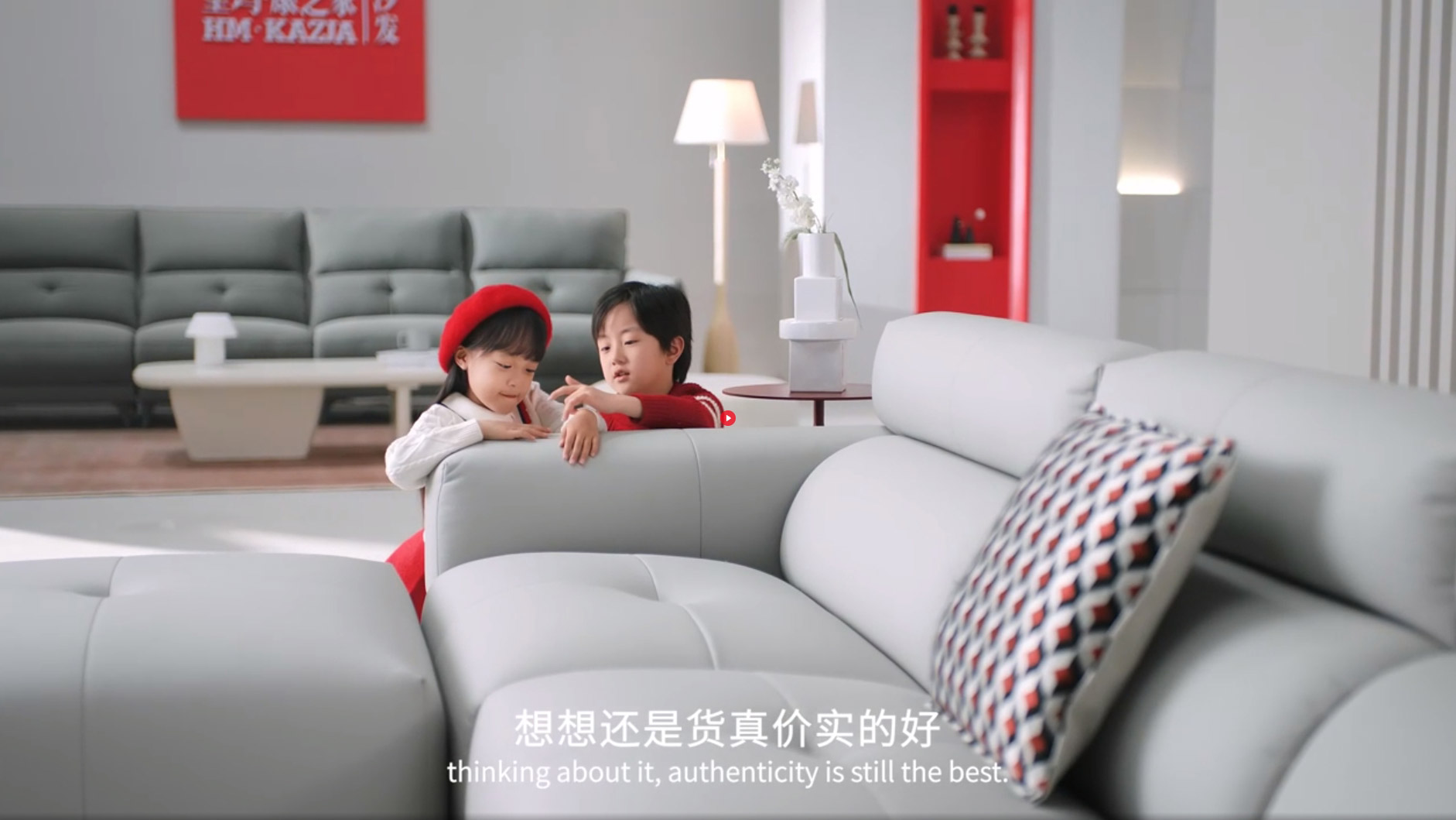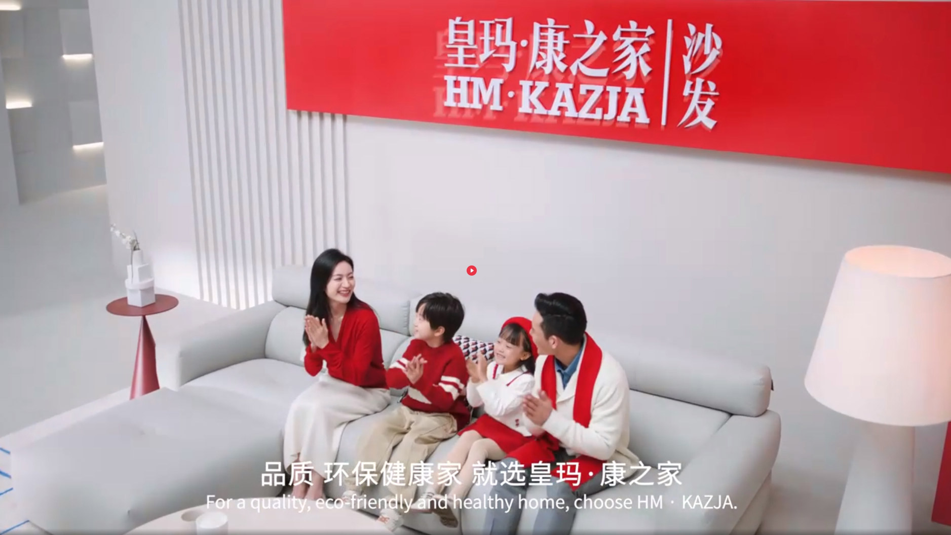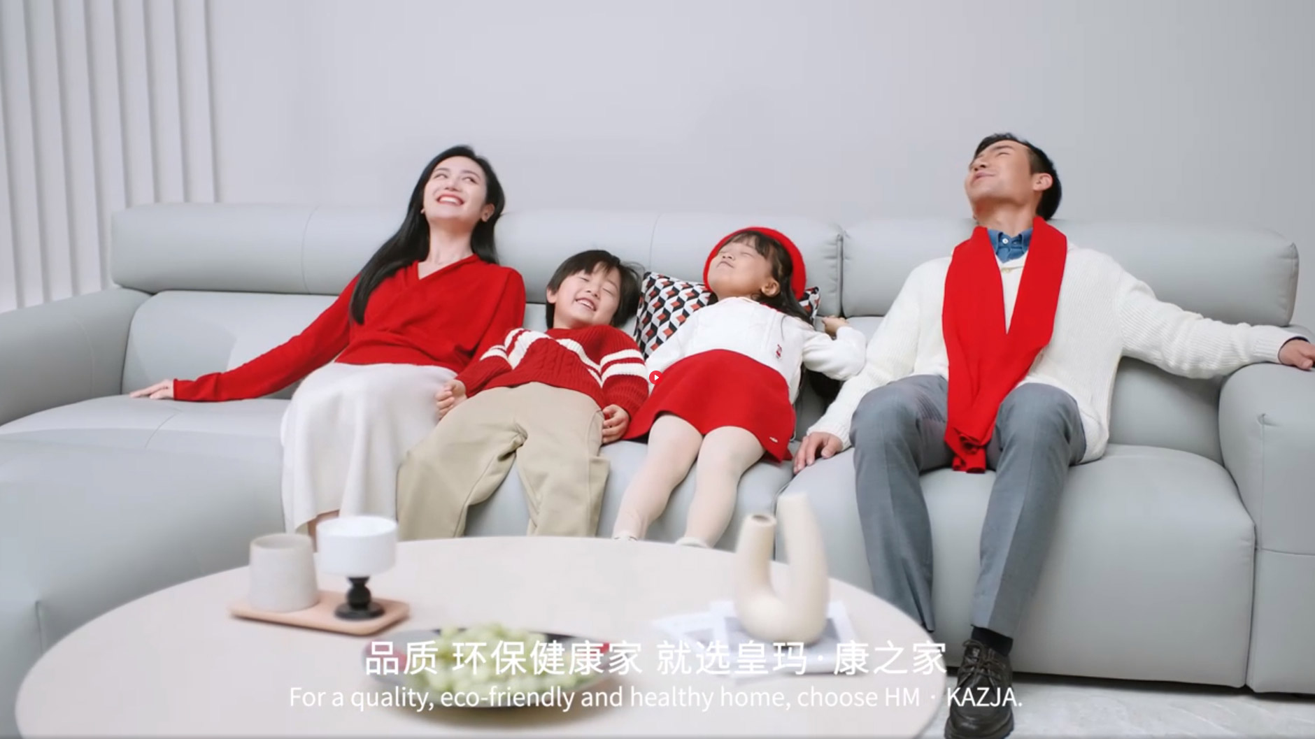 TVC画面采用温情家庭场景。孩子们在皇玛沙发旁嬉戏打闹,天真烂漫的笑容里透着对沙发的全然信任,这种不加修饰的亲近感,比任何广告语都更能证明产品的安全性。年轻夫妻俯身查看沙发细节时的专注,体验坐感后的频频点头,将消费者选购时的谨慎与满意具象化,最后一家四口手拉手躺在沙发上鼓掌的画面,更是将“健康家”的理念落到实处。
